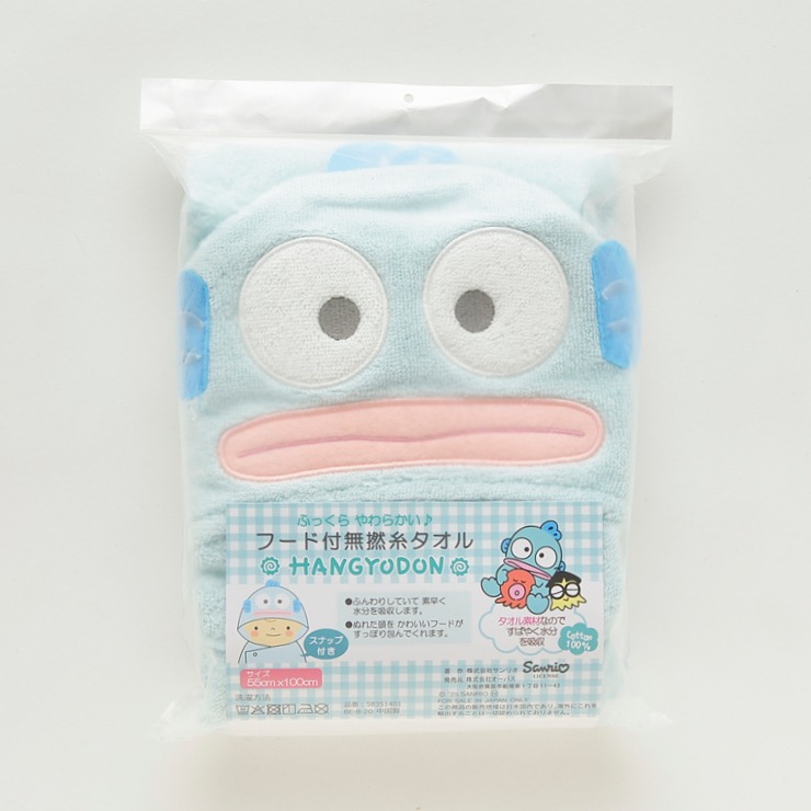 「サンリオキャラクターハンギョドン柄」のフード付きバスタオルです。