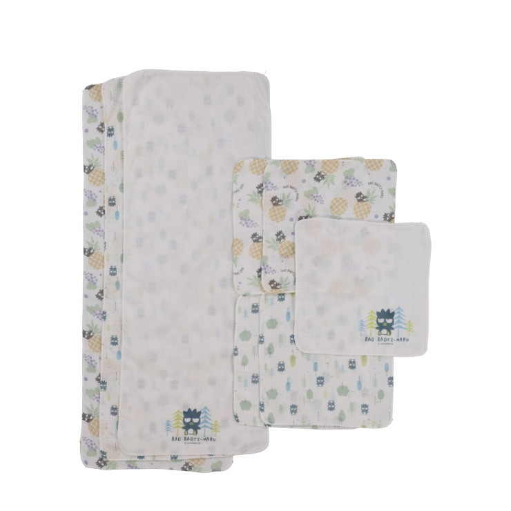 長方形のガーゼタオルが3枚、正方形のガーゼハンカチが5枚入ったお得なセット。