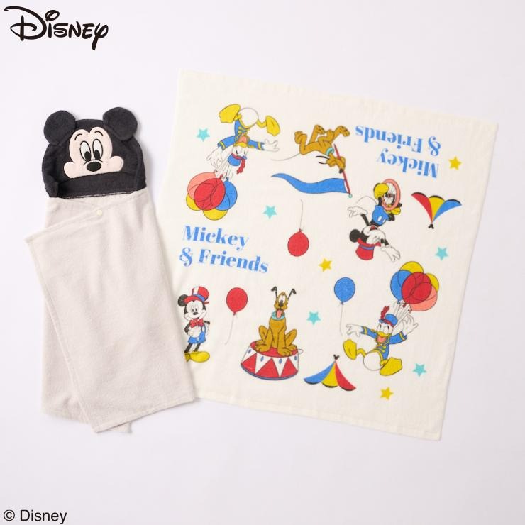 「ディズニーキャラクターミッキー柄」の正方形バスタオルとフード付きバスタオルの 2枚組のセツトです。