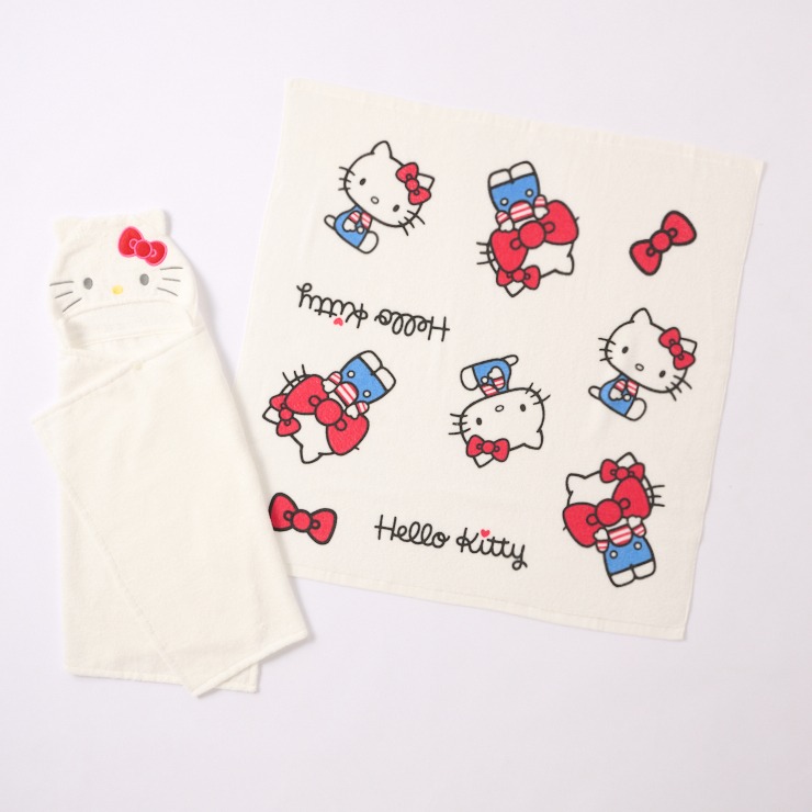 「サンリオキャラクターキティ柄」の正方形バスタオルとフード付きバスタオルの2枚組のセツトです。
