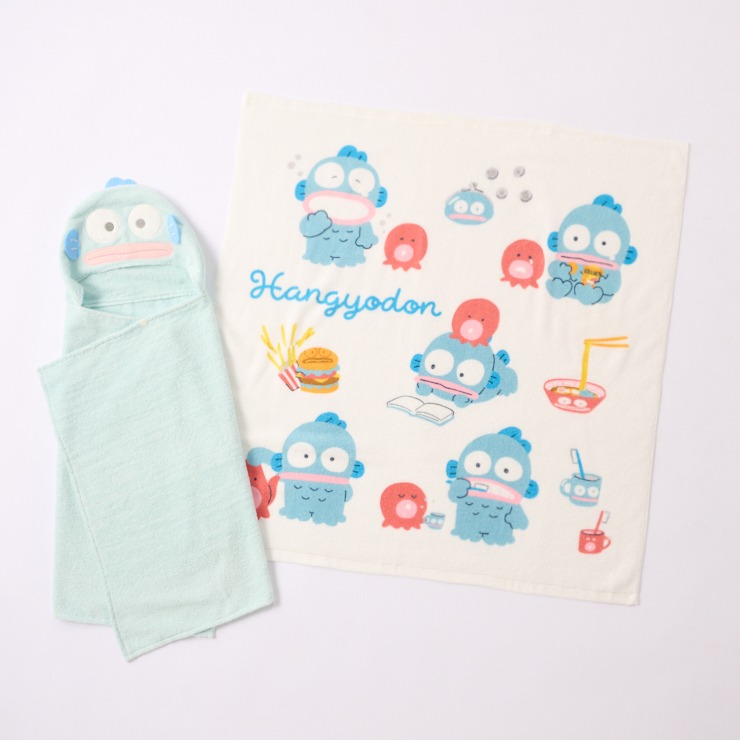 「サンリオキャラクターハンギョドン柄」の正方形バスタオルとフード付きバスタオルの2枚組のセツトです。