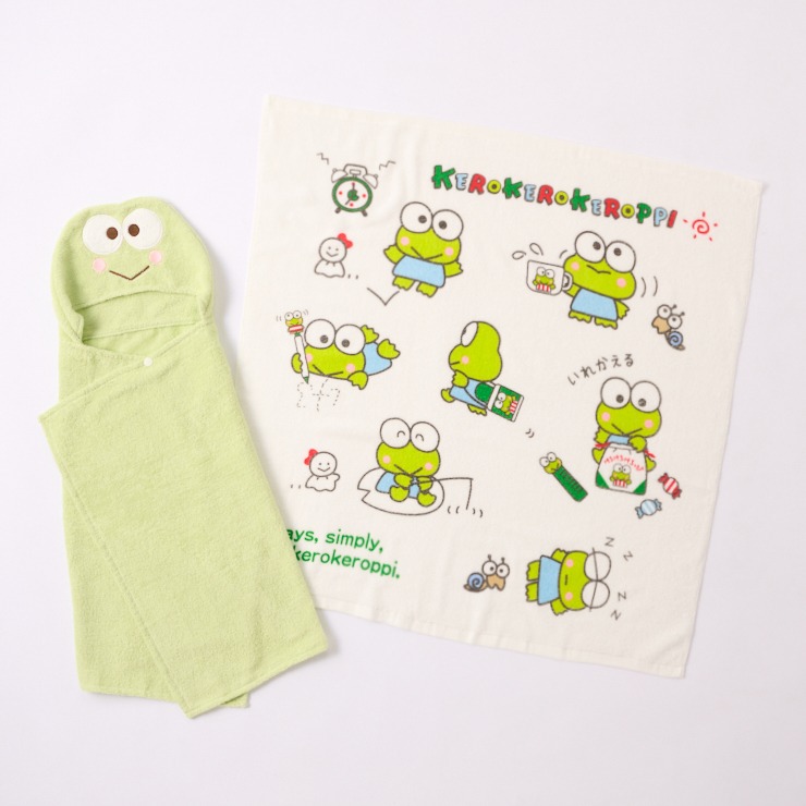 「サンリオキャラクターけろけろけろっぴ柄」の正方形バスタオルとフード付きバスタオルの2枚組のセツトです。