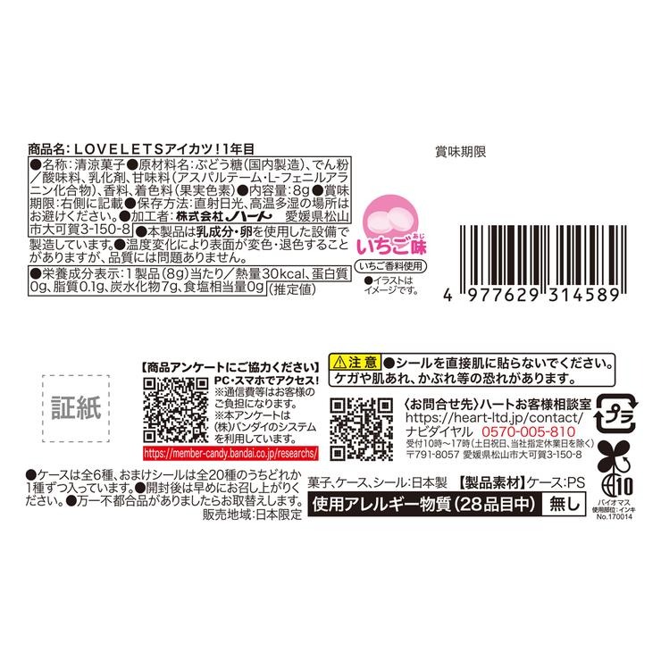 - ●原材料名:ぶどう糖(国内製造)、でん粉/酸味料、乳化剤、甘味料(アスパルテーム・L-フェニルアラニン化合物)、香料、着色料(果実色素)●内容量:8g
