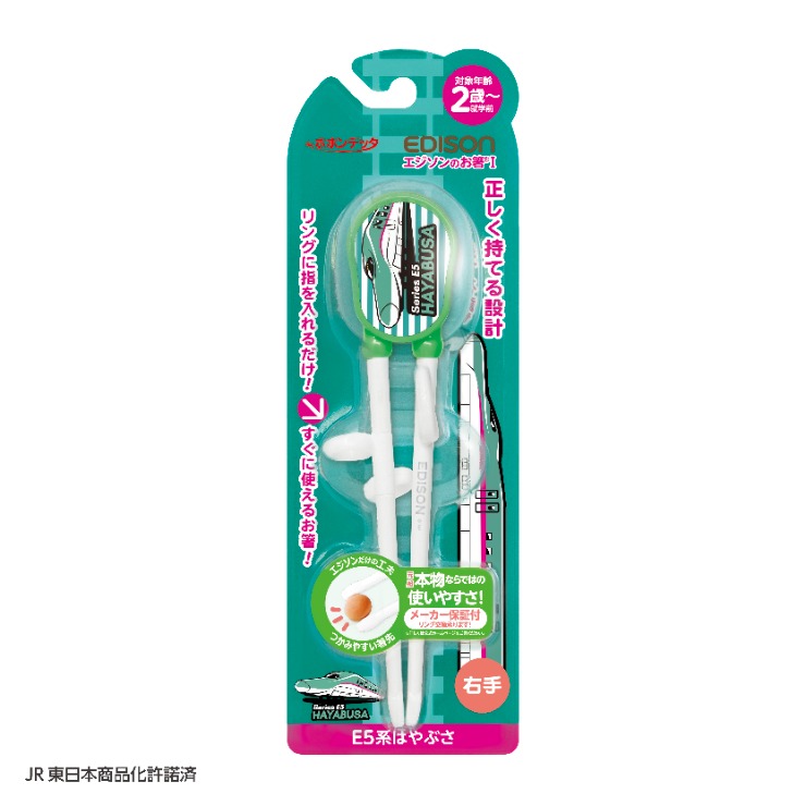 2歳から就学前までのお子さま向けのお箸です。リングに指を入れるだけでやる気をサポート!電車好きのお子様が喜ぶ新幹線がデザインされたお箸です。憧れの新幹線と一緒に楽しくお食事しよう!すべり止め加工された平らな箸先で、滑りやすい食材も掴みやすくなっています。エジソンならではの工夫がたっぷり詰まったお箸は、リングに指を入れるだけでお箸が上手に使えるので、「できた!」を実感できます。