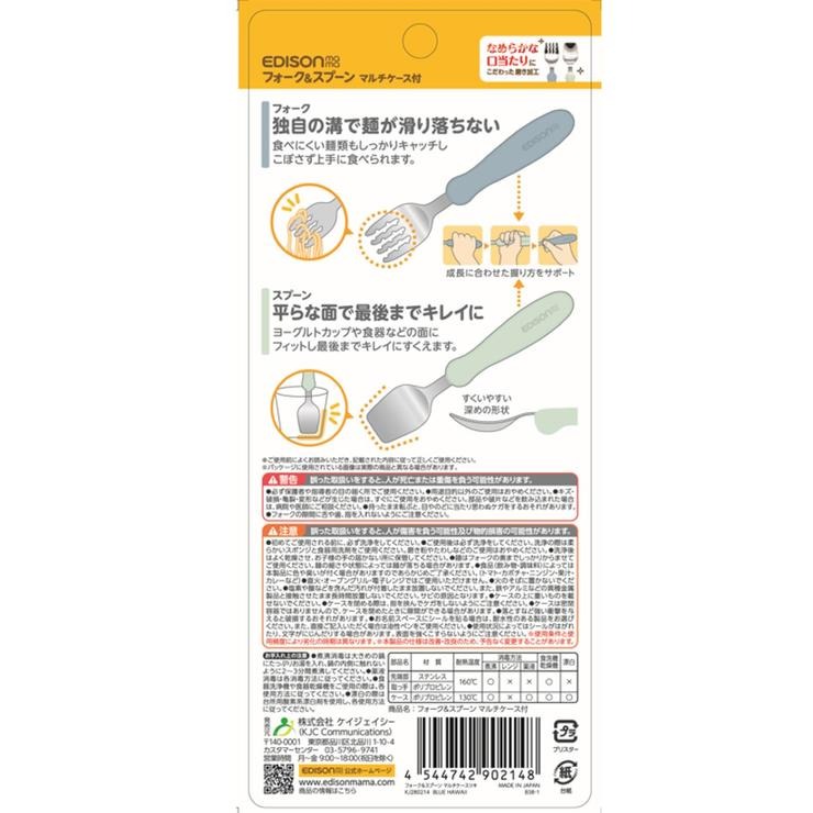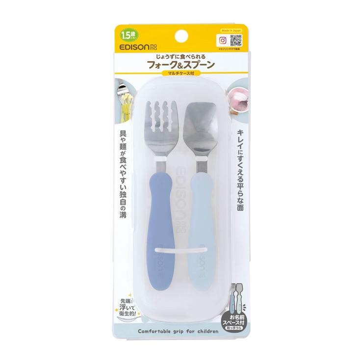 使いやすいから、ひとりでも上手に食べられるフォーク&スプーン。フォークは麺が滑り落ちにくい独自の溝を採用。スプーンは平らな先端がお皿の底にフィットするため最後まできれいにすくえます。上からでも下からでも持ちやすい取っ手。成長に合わせて正しい持ち方をサポートします。先端が浮く衛生統計。持ち運びにも便利な専用ケース付きです。柔らかく落ち着いたカラーなため食卓にも馴染みやすいです。新潟県燕三条の高品質ステンレスを使用。2010年発売以来、長く愛され続けたベストセラーです。