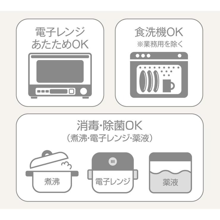 電子レンジあたためOK、食洗器OK、煮沸・電子レンジ・薬液消毒OK