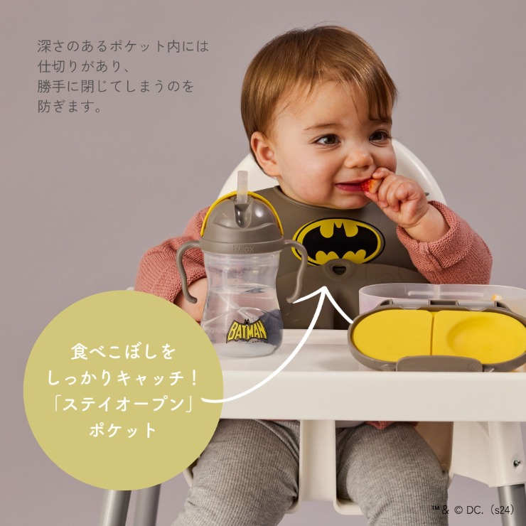 ポケットが塞がらないことで、より多くの食べこぼしをキャッチできます。