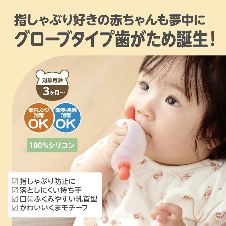 指しゃぶり・おしゃぶり好きの赤ちゃんも夢中!新しい“グローブタイプ”の歯がためです。