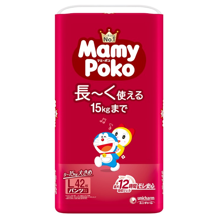 15kgまで長~く使える大きめLサイズ●「大きめおへそすっぽりシェイプ」おへそまでしっかり引きあがる大きめ設計だから長~く使える。●「最大12時間※吸収ジェル」ユニ・チャーム独自の吸収体でおしっこをたっぷり吸収するからず~っとモレ安心。●「トリプルブロックギャザー」3つのギャザーが足回りにぴったりフィットするからすきまモレ安心。●「やわらか設計」ウエストは超ふわふわ。足回りは超なめらか。のびのびフィットで履かせやすい。●「全面通気シート」湿った空気を素早く外に逃がすので、赤ちゃんのお肌は快適。●「おしっこサイン」おむつの交換時期がひと目でわかる。●「らくらくステッチ」手を汚さず脱がしやすい。●「まるめるテープ」簡単かつ衛生的に使用後の処理ができる。●「かわいいドラえもんデザイン」デザインは全部で6種類。1袋に2種類入り。<以下注釈>※赤ちゃんのおしっこ量には個人差があります。