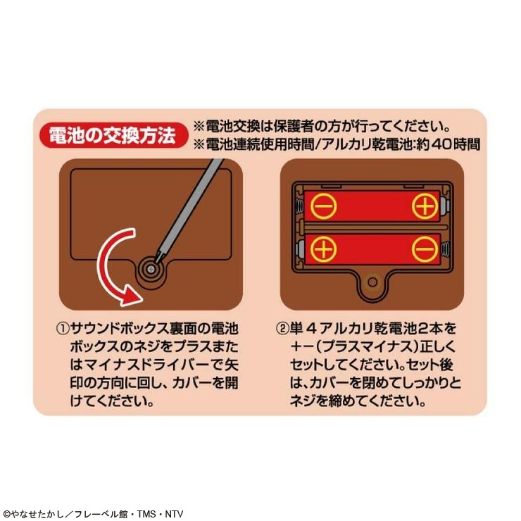●サウンドボックスのボタンを押すとアンパンマンのおしゃべり(6種類)、メロディ(3種類)、流水音が流れます。