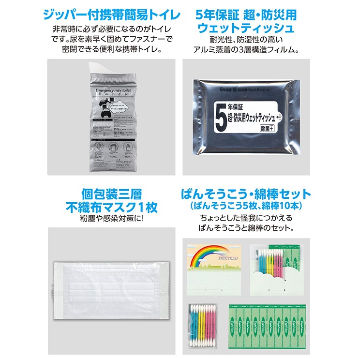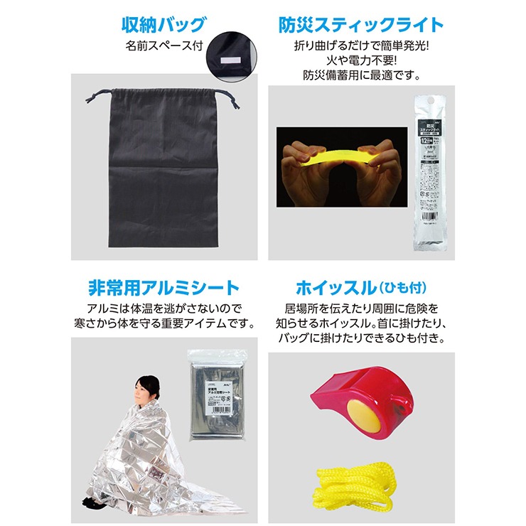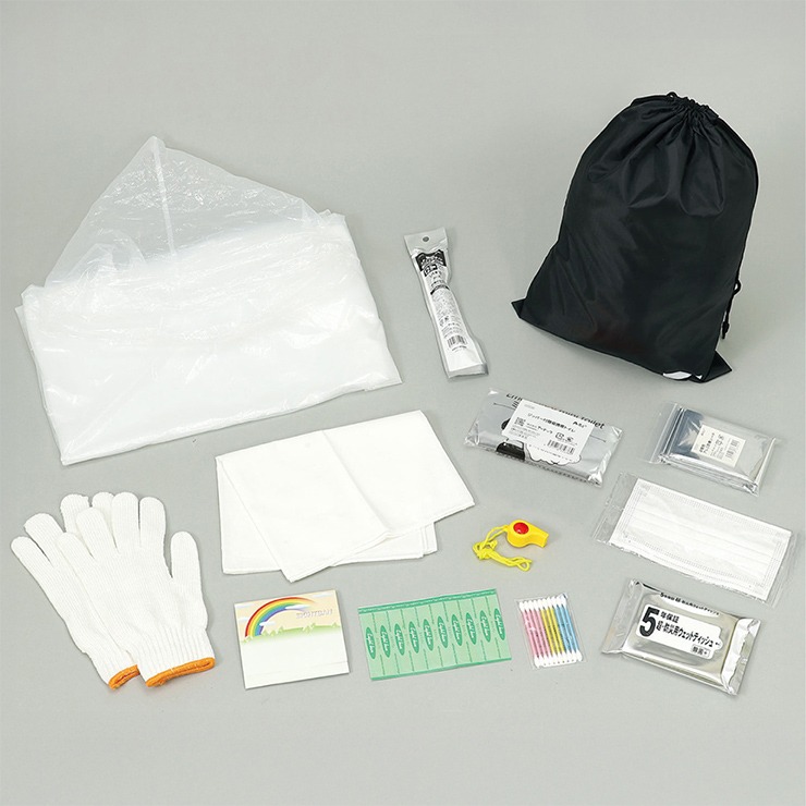 アシストバッグ黒×1、防災用スティックライト×1、非常用アルミシート×1、ホイッスル(ひも付)×1、携帯簡易トイレ×1、防災用ウェットティッシュ×1、不織布マスク×1、エイトバンセット×1、無地てぬぐい×1、レインポンチョ×1、軍手×1組