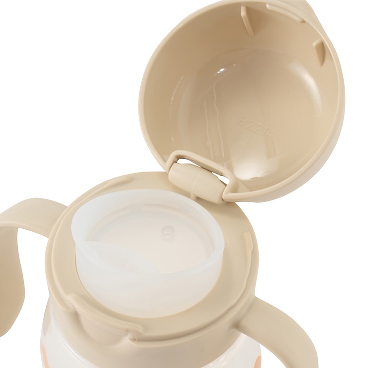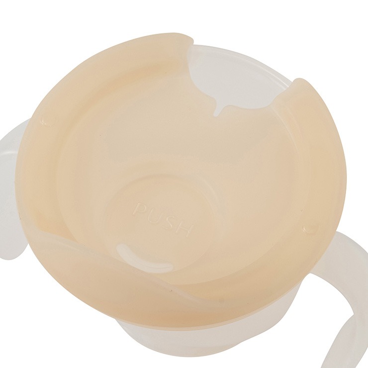コップでの飲み方に慣れるために、フタの縁で練習。小さなお口でもこぼさずに飲めます。