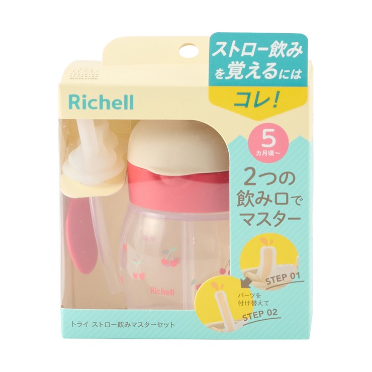 飲み口を付け替えて、ストローの練習からストロー飲みへ、成長に合わせてトレーニングができるセットです。
