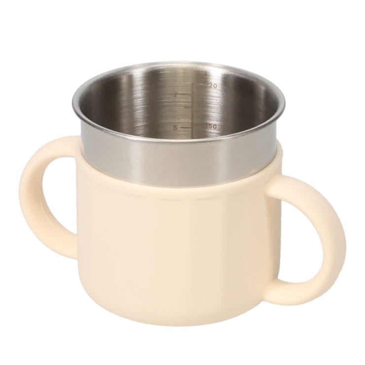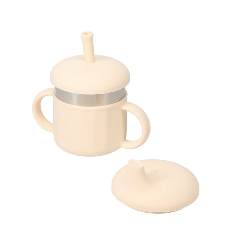 スパウトカップ&ストローカップ2in1仕様。飲み口はやわらかいシリコーン仕様。両手ハンドルは子どもが一人でも持ちやすく、トレニンーグカップとしてぴったり!内カップがステンレス製で衛生的。