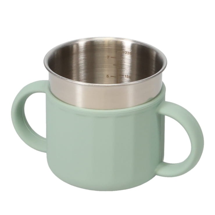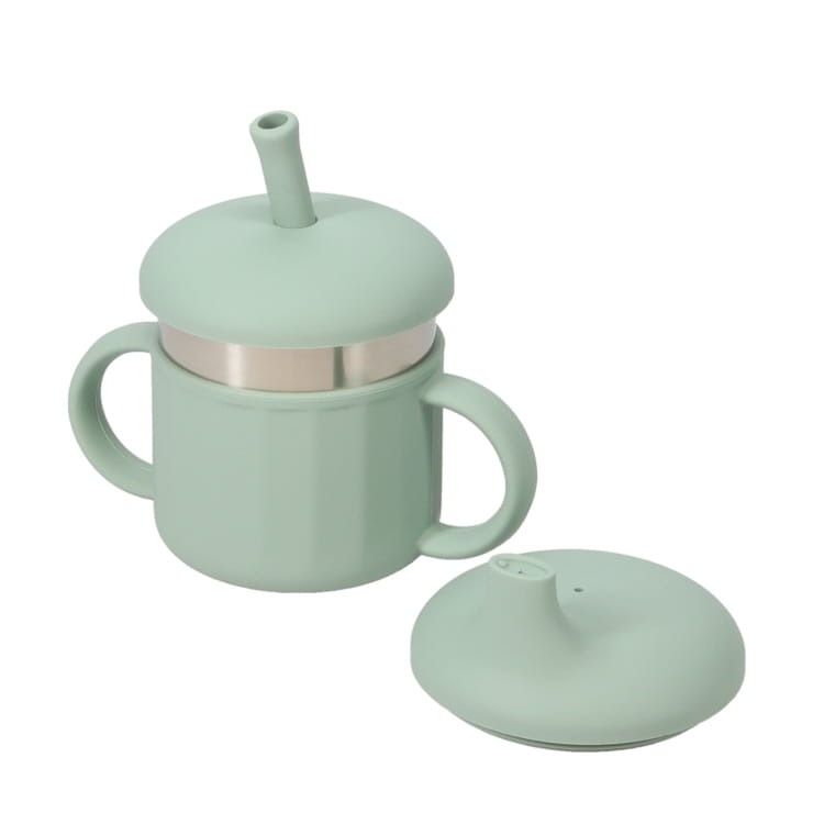 スパウトカップ&ストローカップ2in1仕様。飲み口はやわらかいシリコーン仕様。両手ハンドルは子どもが一人でも持ちやすく、トレニンーグカップとしてぴったり!内カップがステンレス製で衛生的。