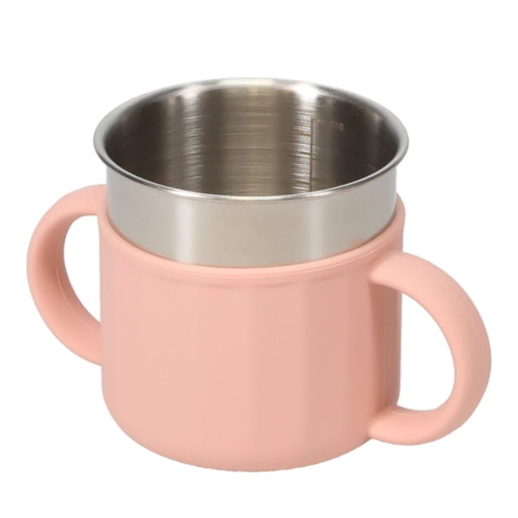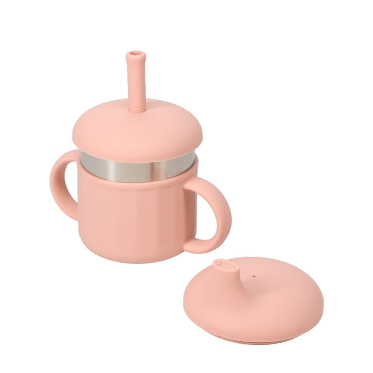 スパウトカップ&ストローカップ2in1仕様。飲み口はやわらかいシリコーン仕様。両手ハンドルは子どもが一人でも持ちやすく、トレニンーグカップとしてぴったり!内カップがステンレス製で衛生的。