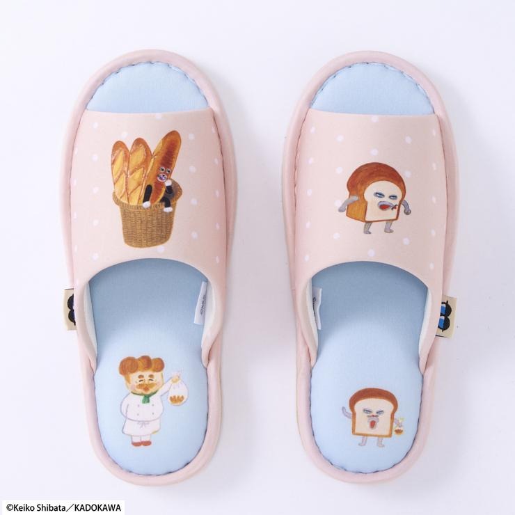 シンプルなドット柄に「パンどろぼう」と「なぞのフランスパン」がプリントされたスリッパです。