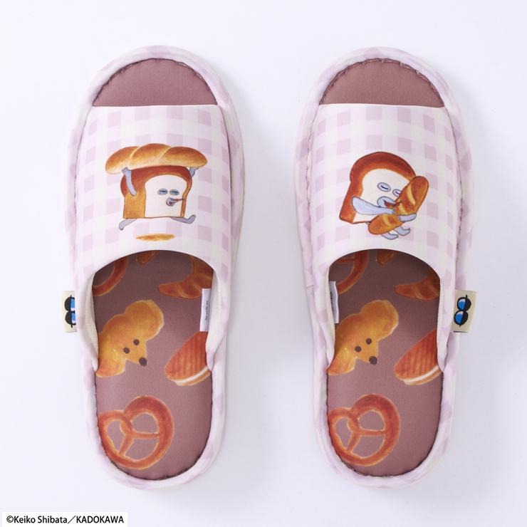 大きめのチェック柄に左右で表情の違う「パンどろぼう」がプリントされたスリッパです。