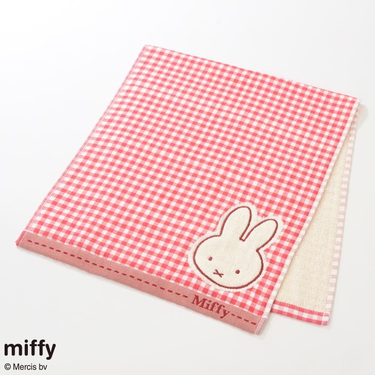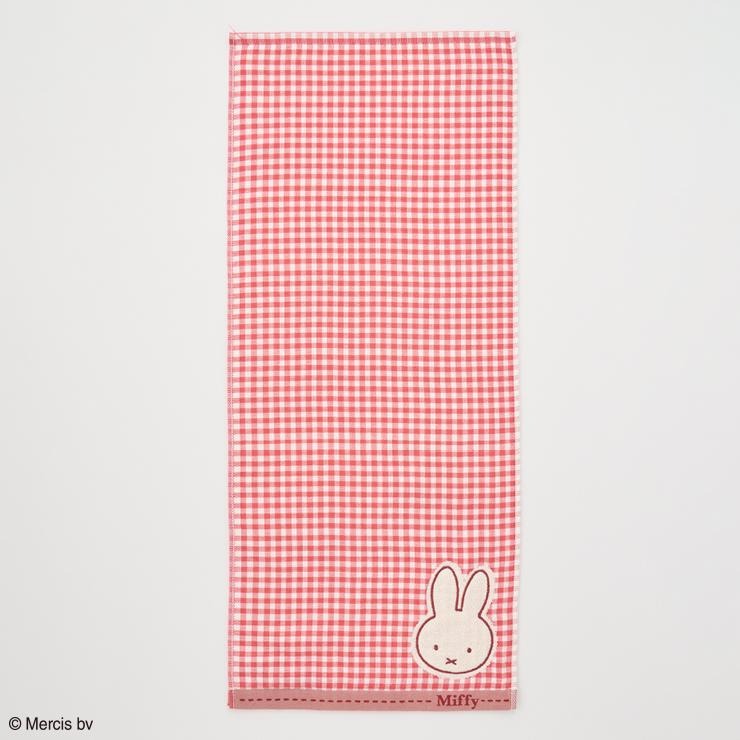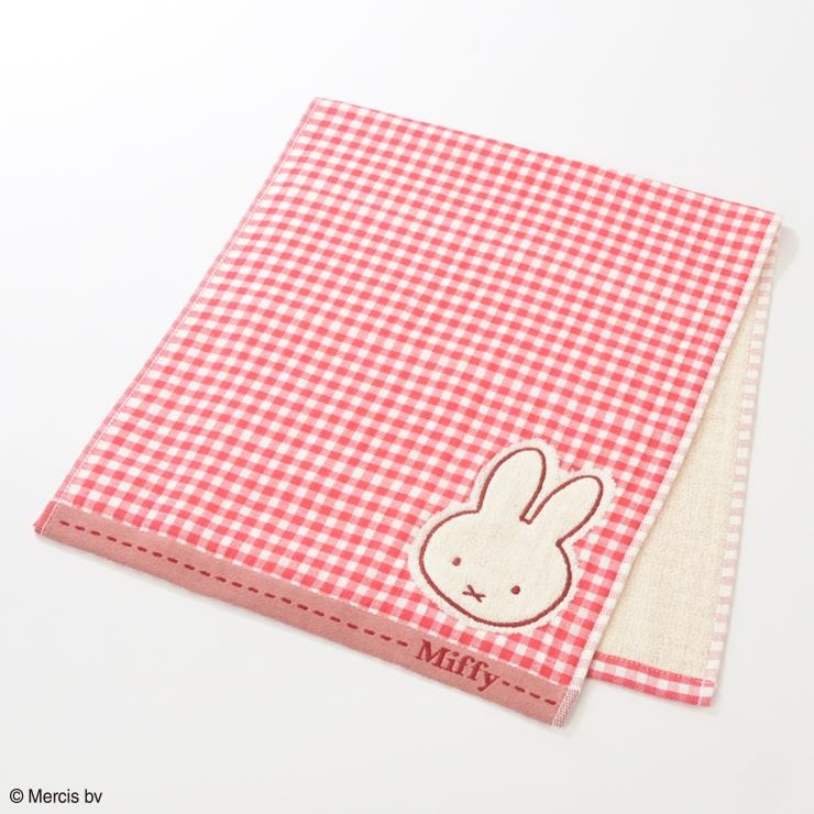 赤チェックにミッフィーのお顔がデザインされたタオルです。