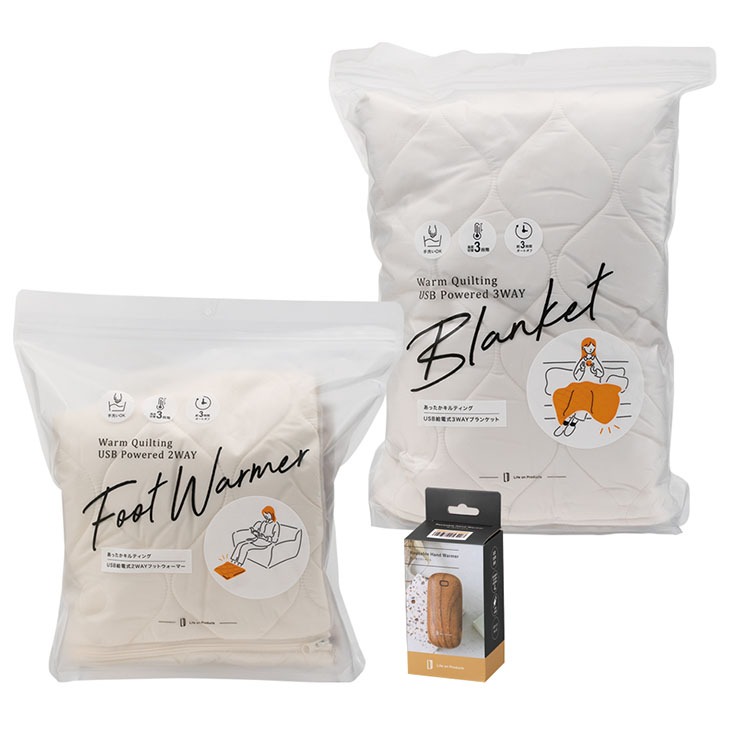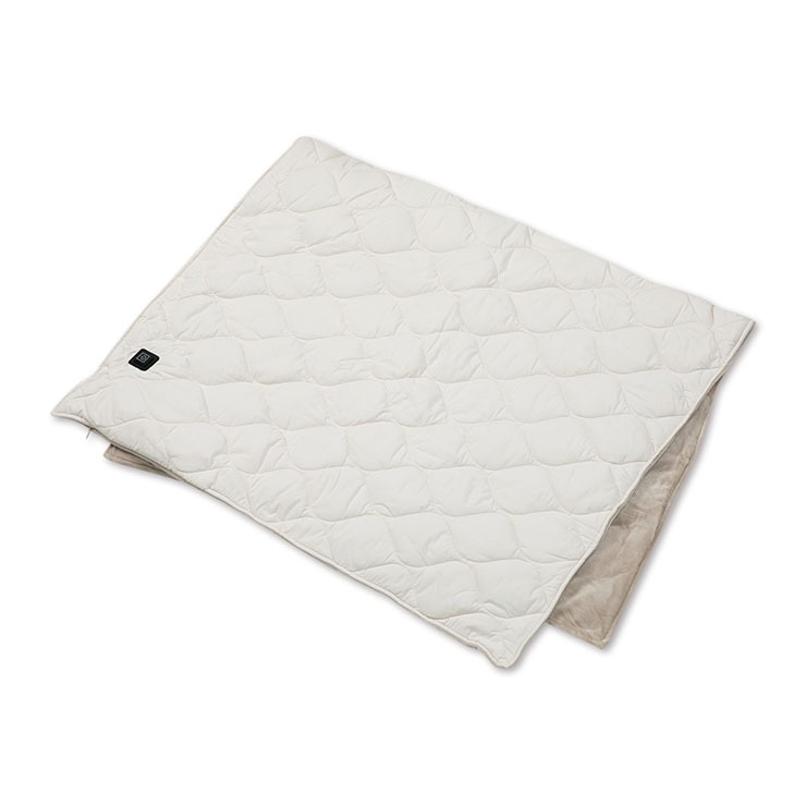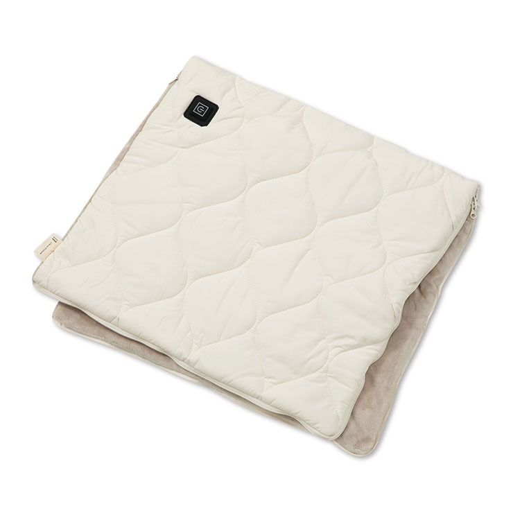 モバイルバッテリー使用で室内はもちろん、冬キャンプやスポーツ観戦などアウトドアにも大活躍のヒーター内蔵ブランケット。ファッション性にもこだわり、カラーはカーキとアイボリーの2色展開。表地は波ステッチをあしらったキルティングを、裏地は肌触りのよい水晶ボアを採用しました。軽さと温かさ、そして羽織る・巻く・掛けるの3WAYを実現。おうち時間を温かく快適にしてくれます。