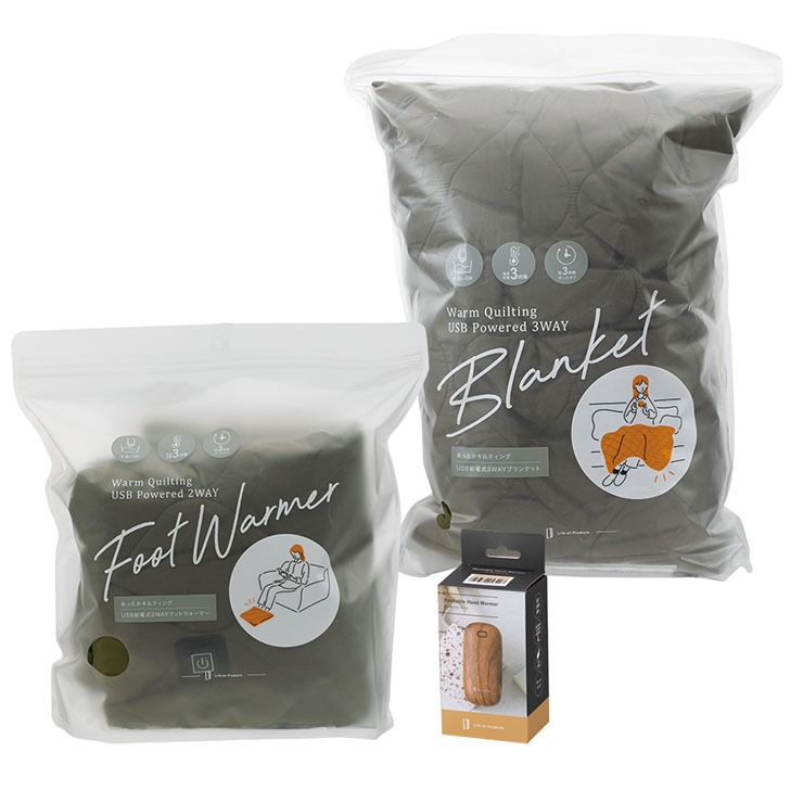 モバイルバッテリー使用で室内はもちろん、冬キャンプやスポーツ観戦などアウトドアにも大活躍のヒーター内蔵ブランケット。ファッション性にもこだわり、カラーはカーキとアイボリーの2色展開。表地は波ステッチをあしらったキルティングを、裏地は肌触りのよい水晶ボアを採用しました。軽さと温かさ、そして羽織る・巻く・掛けるの3WAYを実現。おうち時間を温かく快適にしてくれます。