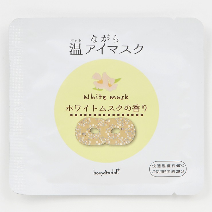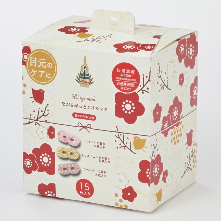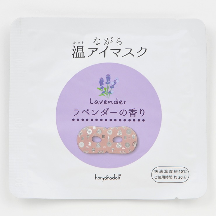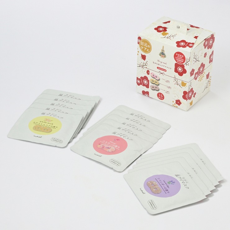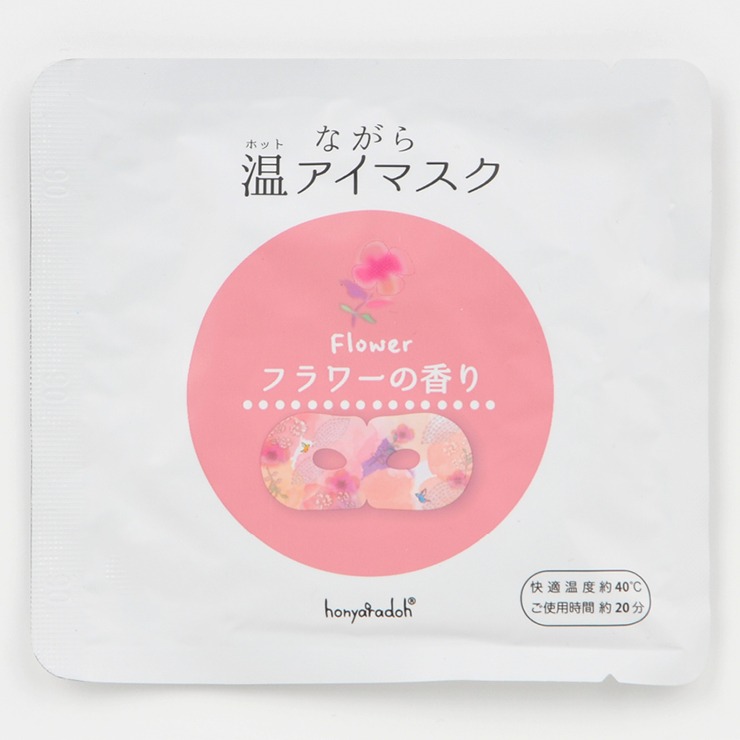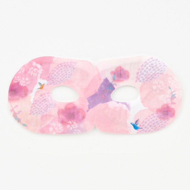 目の部分に穴が空いているオープンタイプのアイケア。作業を妨げずにリラックスできるのが大きな利点です。約40℃の心地よい温かさが約20分間持続。フラワー、ホワイトムスク、ラベンダーの香り×デザインの組み合わせで気分や好みに合わせて選べます。