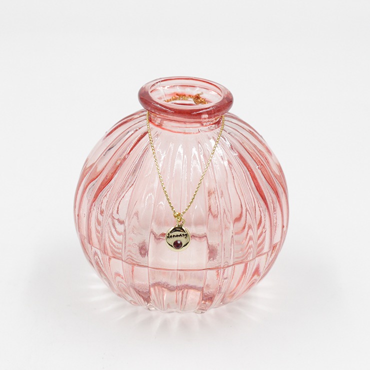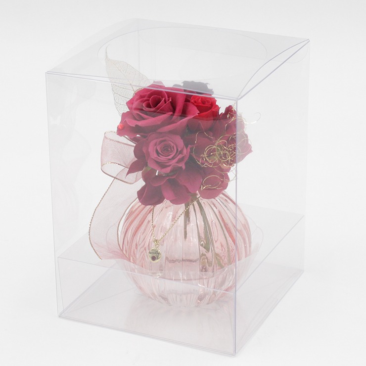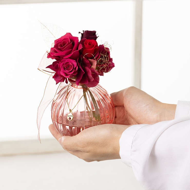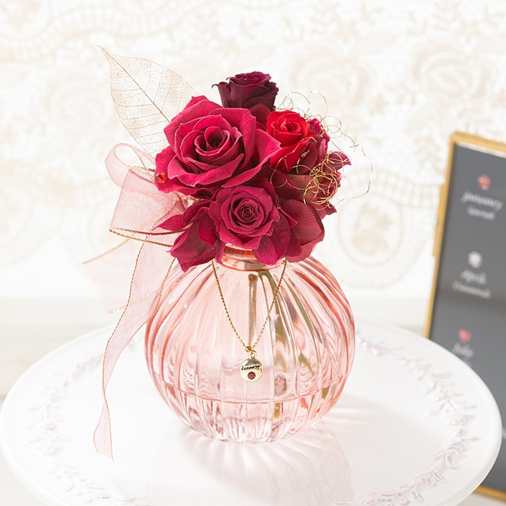 美しく開花したプリザーブドフラワーのバラの花弁には、まるでガーネットのようなラインストーンがキラリ。コロンと愛らしいピンクのガラスボトルは、ネックレス風の誕生石チャームでおめかししています。