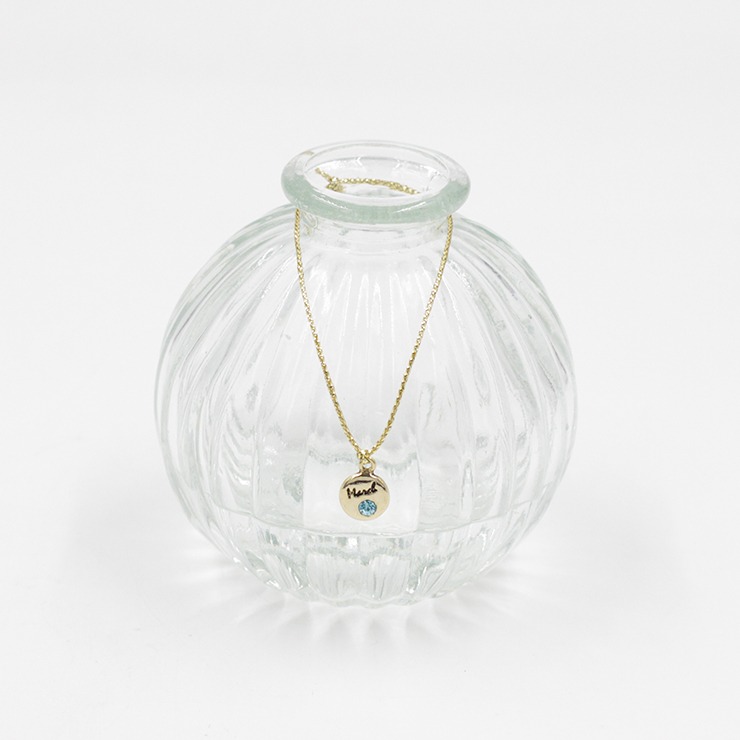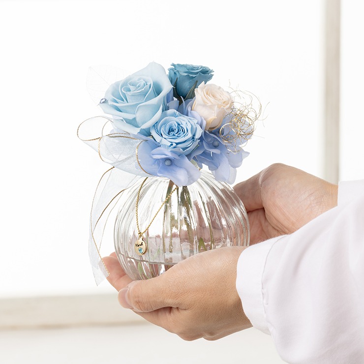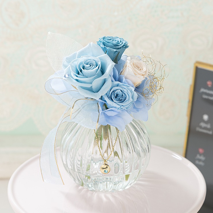 美しく開花したプリザーブドフラワーのバラの花弁には、まるでアクアマリンのようなラインストーンがキラリ。コロンと愛らしいクリアのガラスボトルは、ネックレス風の誕生石チャームでおめかししています。
