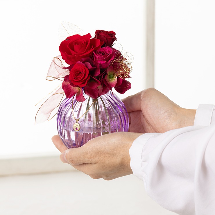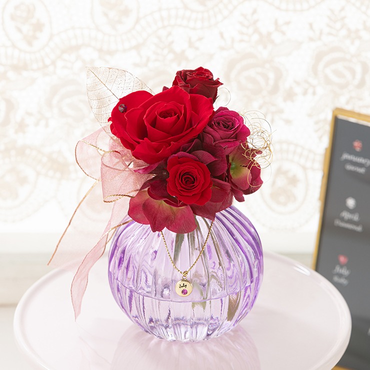 美しく開花したプリザーブドフラワーのバラの花弁には、まるでルビーのようなラインストーンがキラリ。コロンと愛らしいパープルのガラスボトルは、ネックレス風の誕生石チャームでおめかししています。