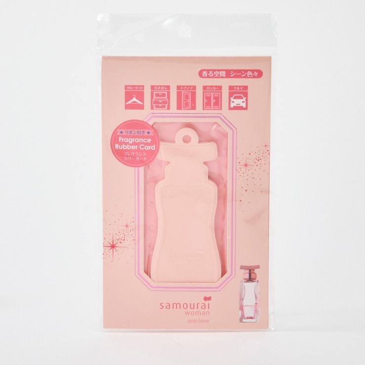●カードタイプのお部屋用マルチフレグランスに「サムライウーマン ワンラブ」の香りが登場! ●クローゼット・お部屋・車にも、使い方いろいろ! ●お部屋・オフィス・車・ジムで! 様々なシーンでフレグランスの上質な香りが楽しめる! ●香水瓶を模ったゴム素材を採用。 ●一般的な紙素材に比べ耐久性に優れます。 ●本体の香りが長持ち! 経過と共に使用シーンを変えて長く香りを楽しめる! ※ 本体自体は長くて半年程度香ります。 ※ 環境によって香りの持続時間は異なります。 ※ メーカー調べ ●みずみずしさが広がる、甘さわやかな「サムライウーマン ワンラブ」の香り。