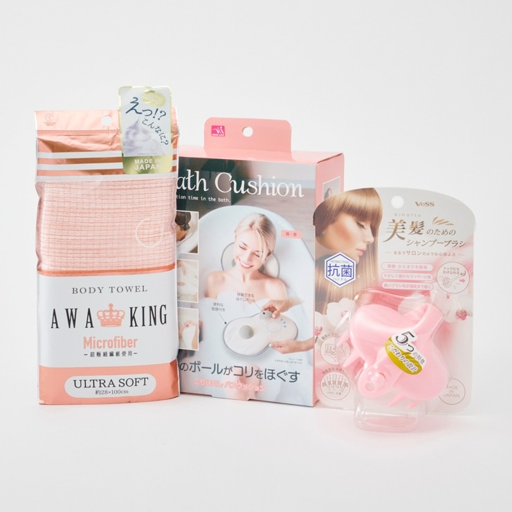 バスクッション、シャンプーブラシ、ボディタオルがそれぞれ1点入ったお買い得セット♪
