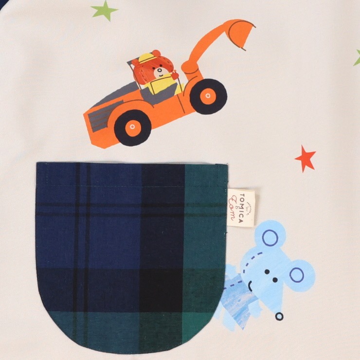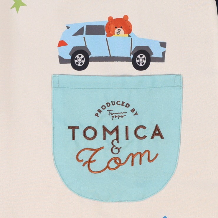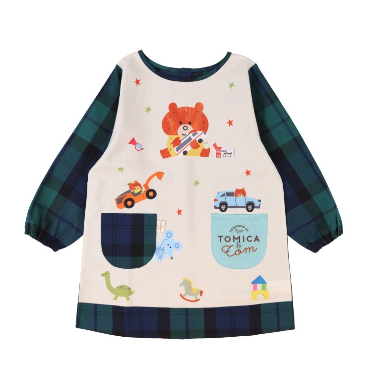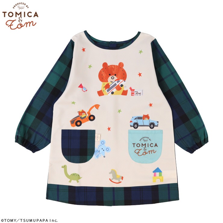 育児のマンガが人気のクリエーター「つむぱぱ」さんがトミカの世界を描いた絵本「トミカとトム」の割烹着。