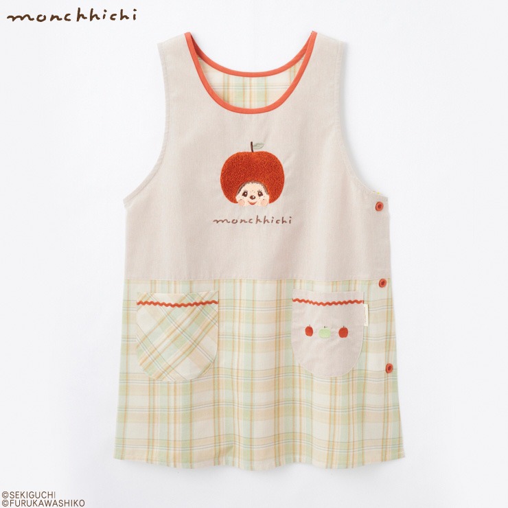 リンゴを被ったモンチッチアップリケのエプロン。モンチッチアップリケはサガラ刺しゅう仕上げ。