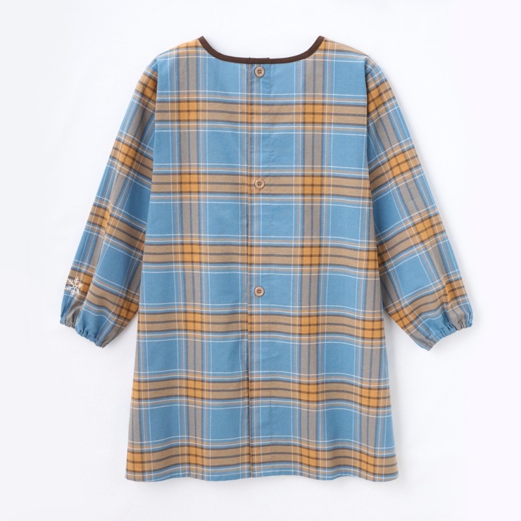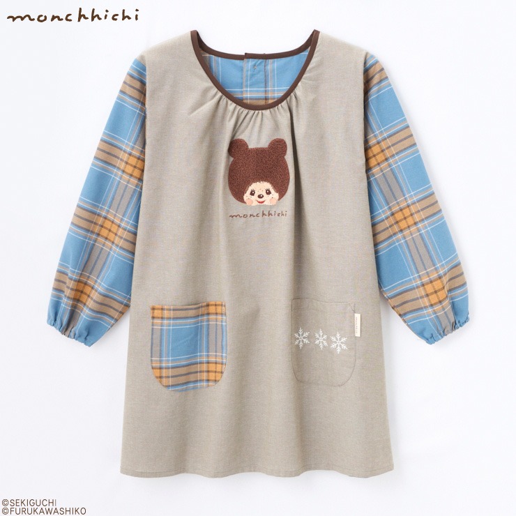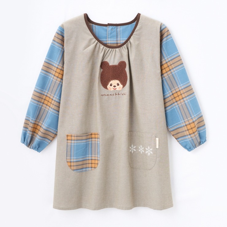 クマを被ったモンチッチアップリケのかっぽうぎ。モンチッチ部分はサガラ刺しゅう仕上げ。