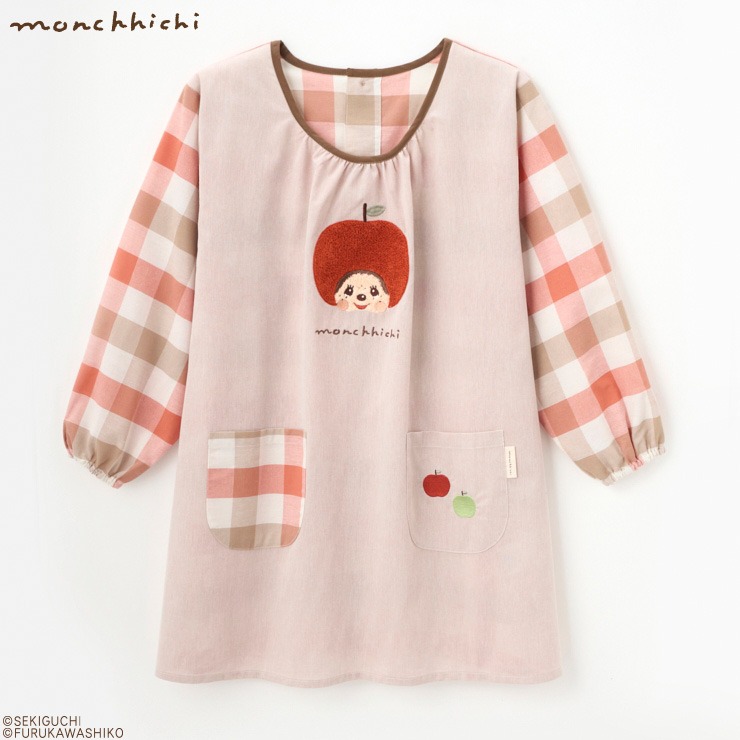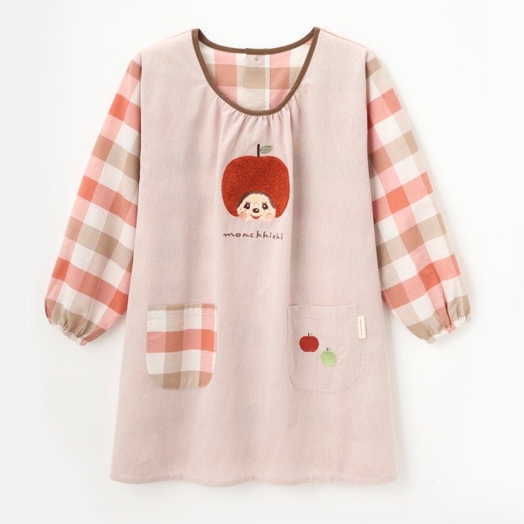 リンゴを被ったモンチッチアップリケのかっぽうぎ。モンチッチアップリケはサガラ刺しゅう仕上げ。