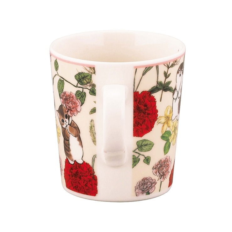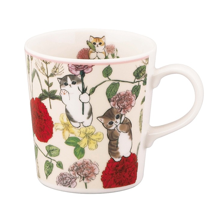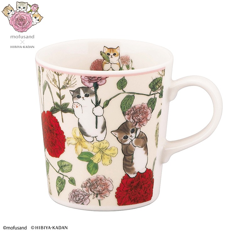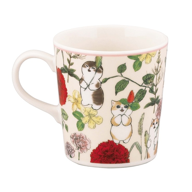 色とりどりの花の中で楽しそうな『mofusandのにゃんこたち』が描かれているマグカップ。
