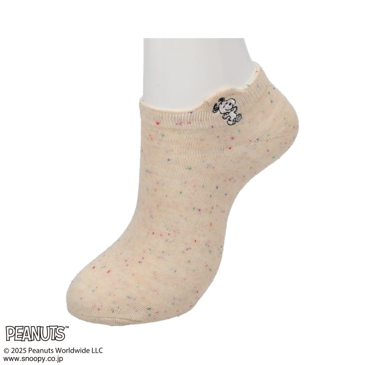 カジュアルになりすぎないさりげないPEANUTSデザインがポイントのソックス。