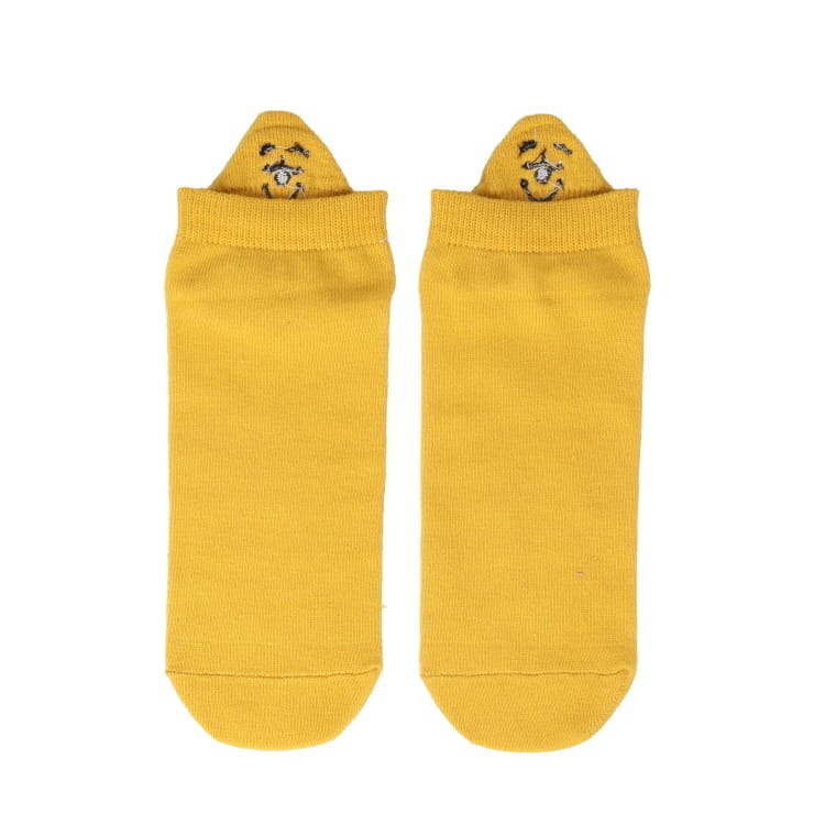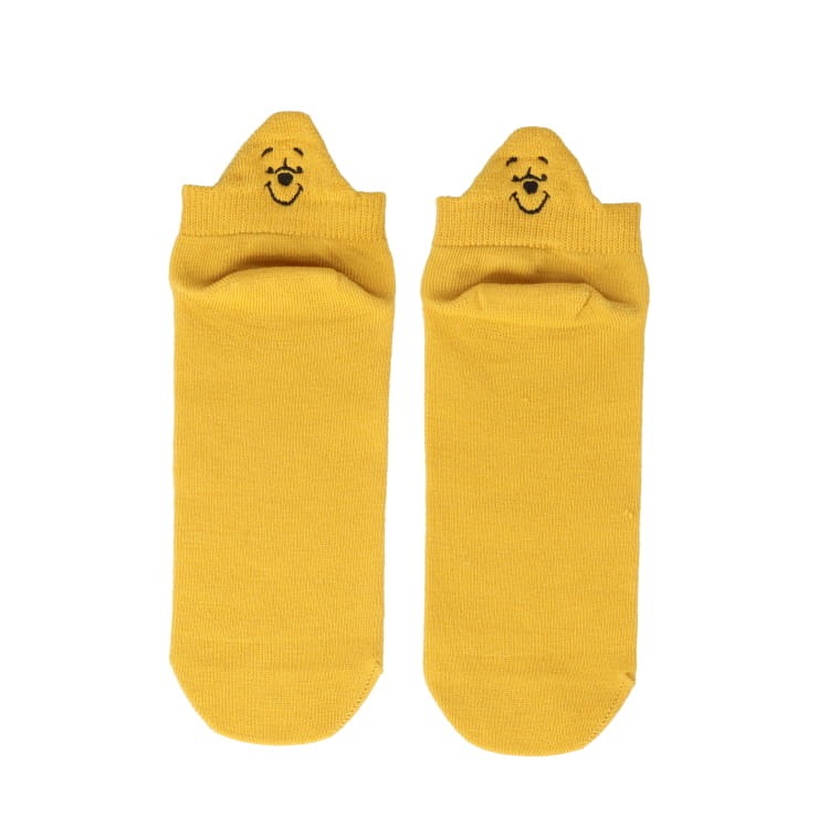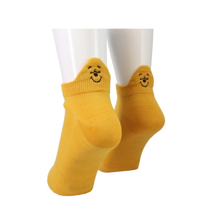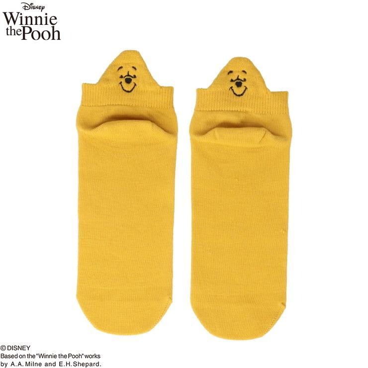 かかと部分に突起を編み込みその部分にプーさんの刺繍を付けてます。