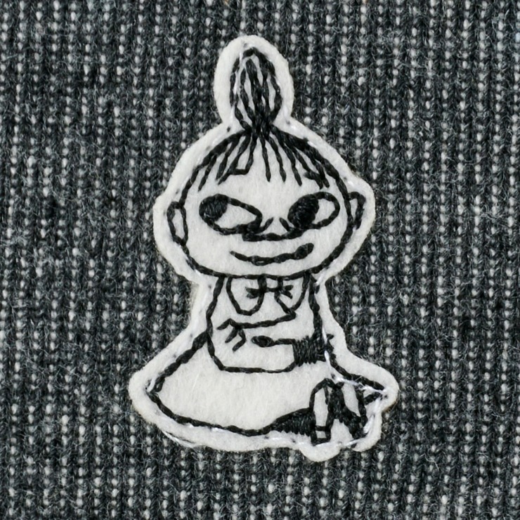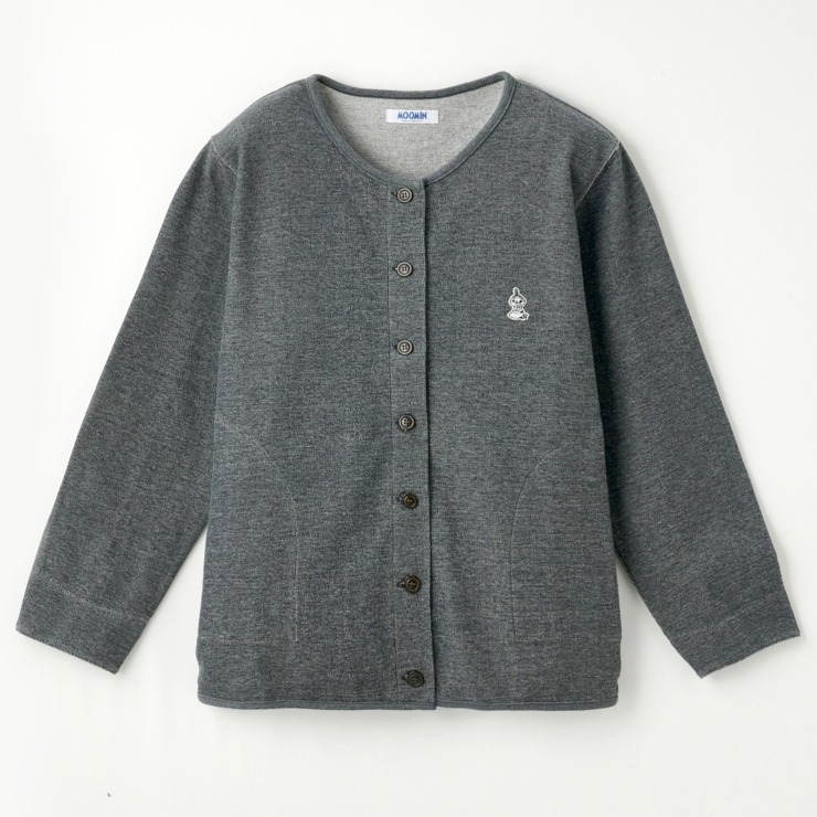 ムーミン谷のキャラクターの刺繍ワッペンをつけた裏毛素材のカーディガン。