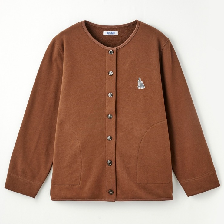 ムーミン谷のキャラクターの刺繍ワッペンをつけた裏毛素材のカーディガン。