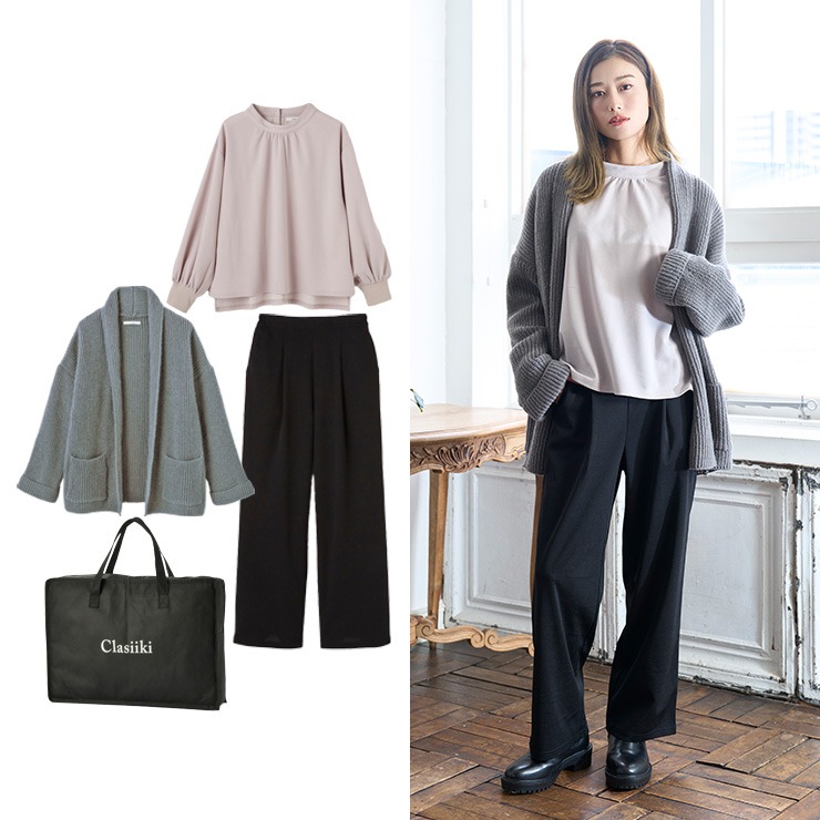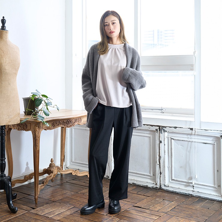 着心地の良いストレッチジョーゼットのブラウスとパンツにサッと羽織れるカーディガンをセットしました。