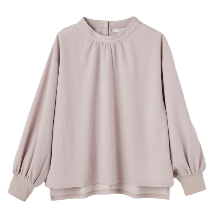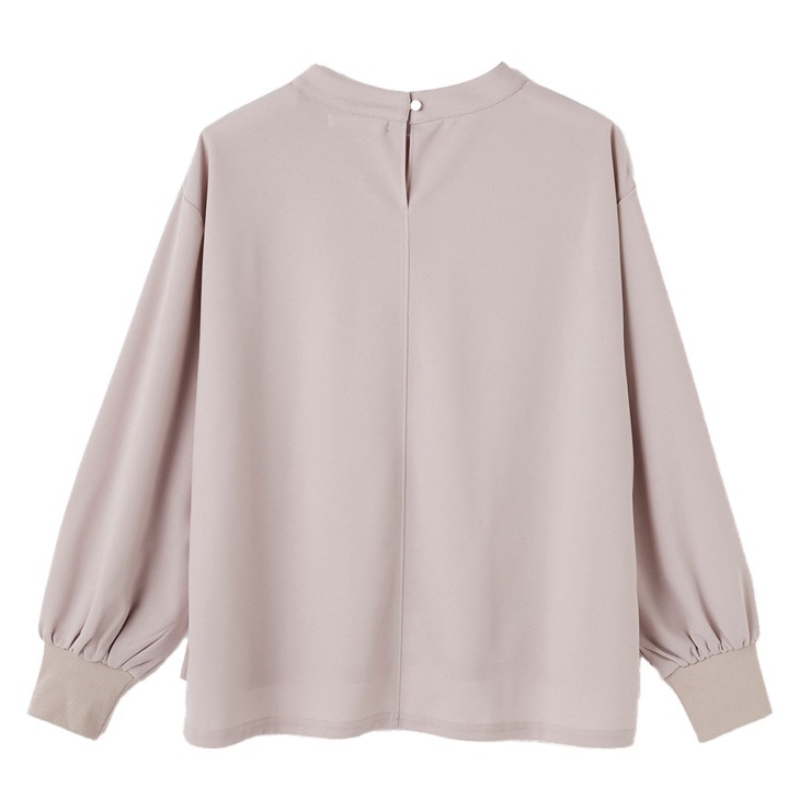 ブラウスはスタンドカラーと身頃にほんのりいれたギャザーがポイントです。シルバーのボタンでよりシックに仕上げました。