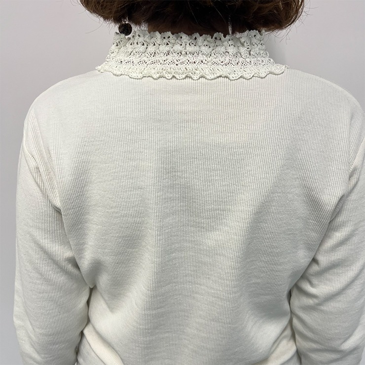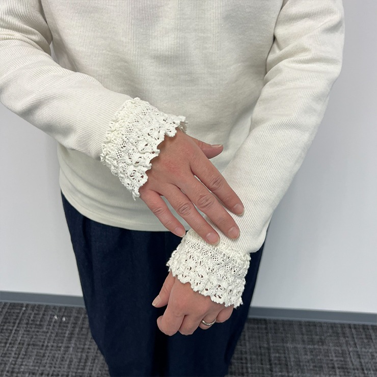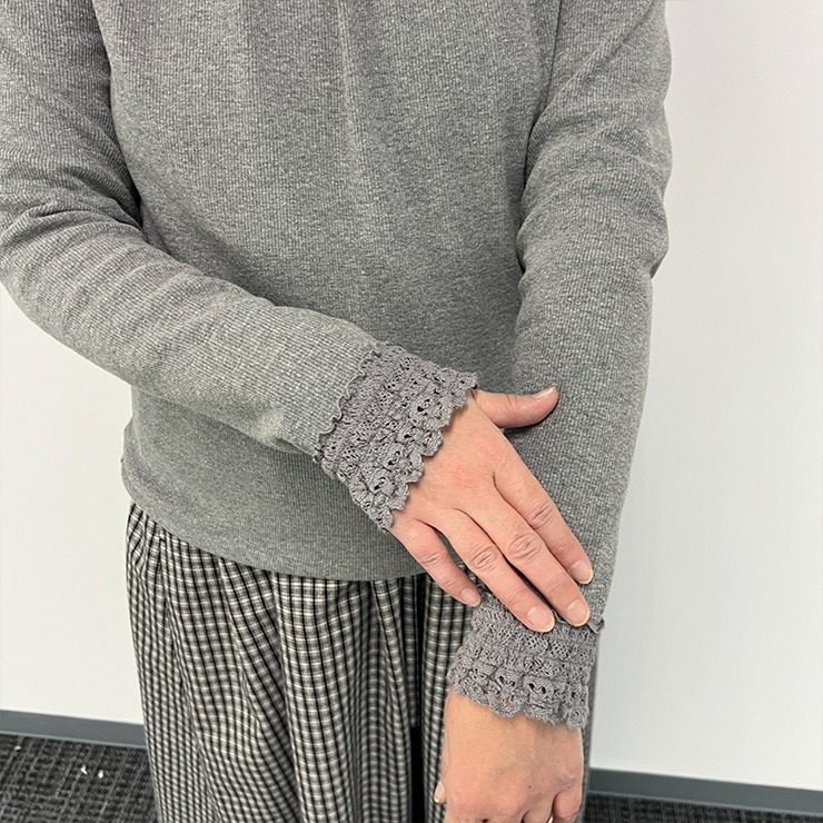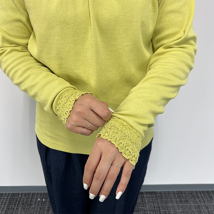 首元、袖口からレースをのぞかせて着るコーディネートがおすすめです。
