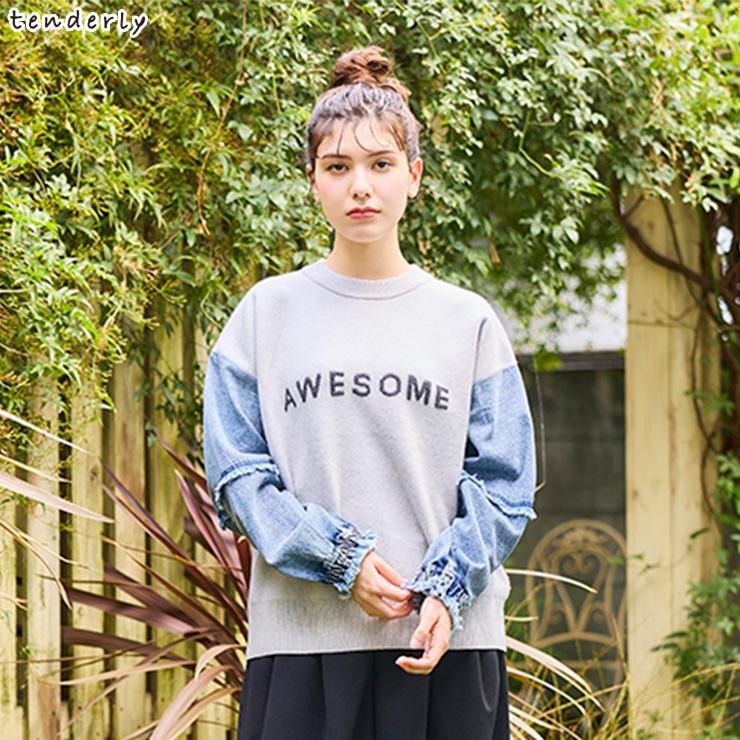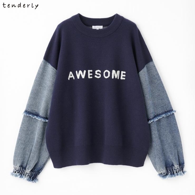 バルーンスリーブのデニム袖がポイントのロゴニット。