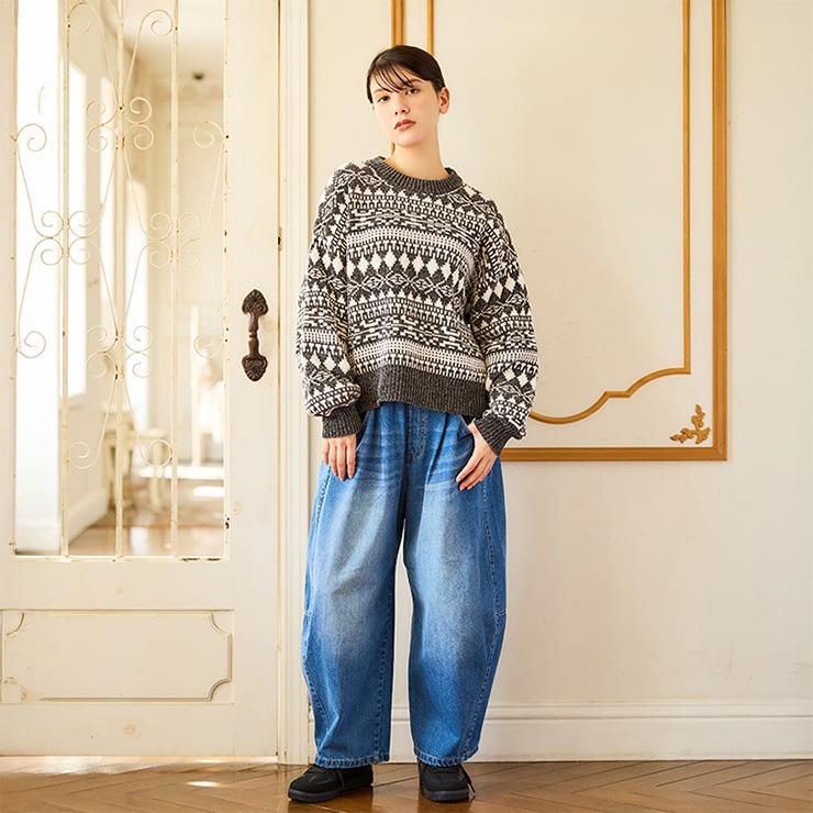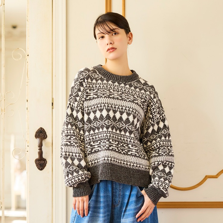 さりげなくラメが入ったノルディック柄のニット。柔らかく手触りの良いモール糸を使っているので着心地も◎ レトロなノルディック柄が可愛いアイテムです。
