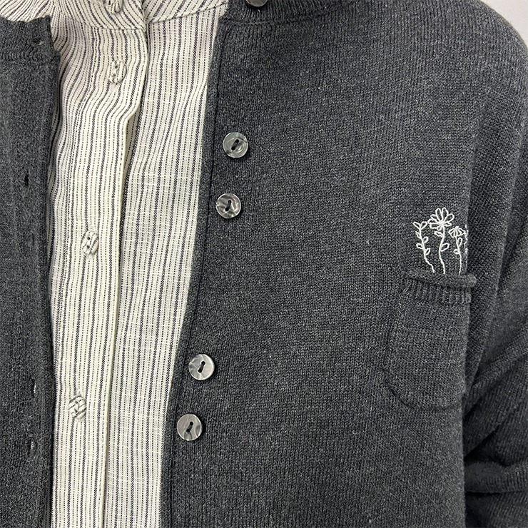 ポケット口に付いた刺繍がポイントのニットカーディガン。