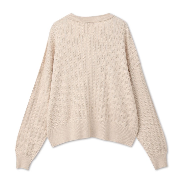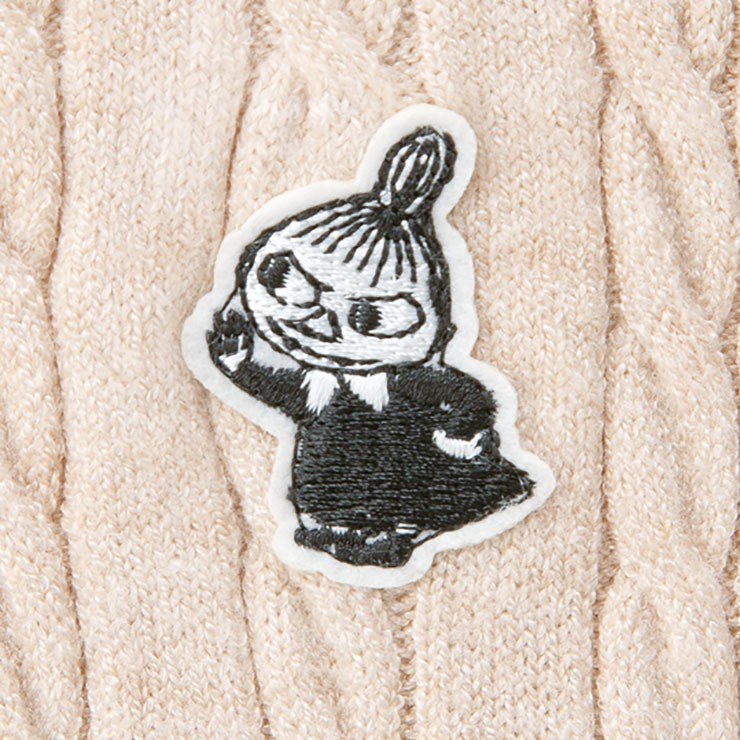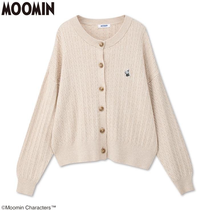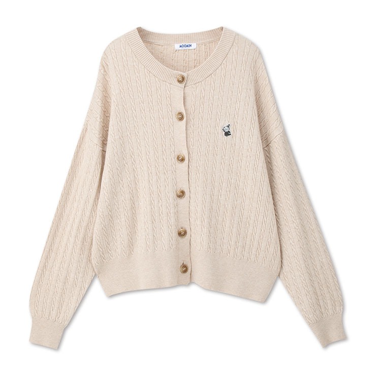 ムーミン谷のキャラクターの刺繍ワッペンをつけたニットカーディガン。ケーブル編みのシックな雰囲気に、胸元の刺繍が目を引くポイントに。