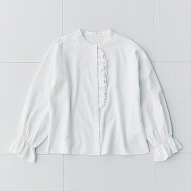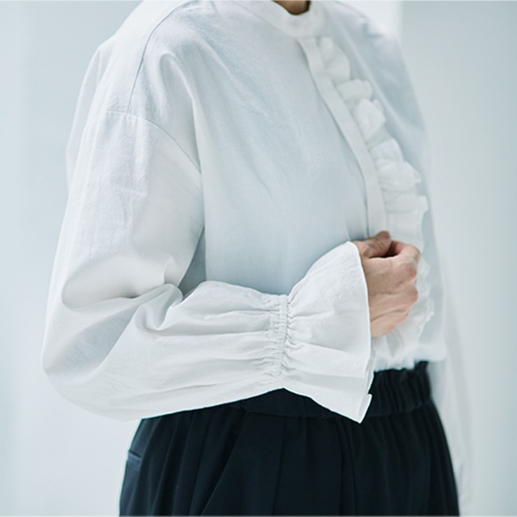 肌ざわりのよいやわらかなコットン100%素材を使用した、フリルデザインがポイントのブラウス。オケージョン服としてはもちろん、オフィスシーンや日常でも活躍できます。袖口にはゴムを加え袖まくりもしやすい作りになっております。