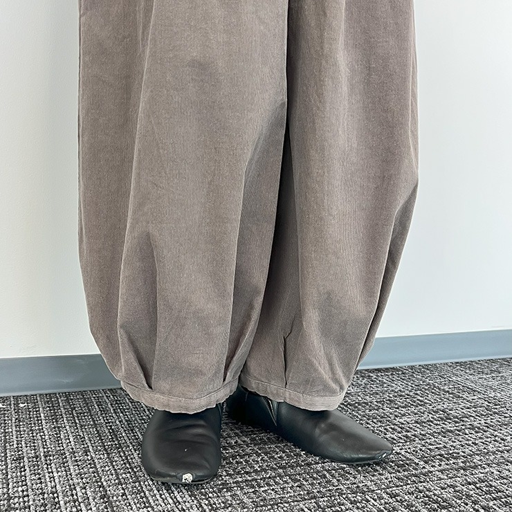 裾にタックを施し立体感あるシルエットが脚のラインを拾わずカバーしてくれます