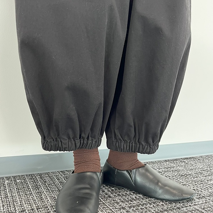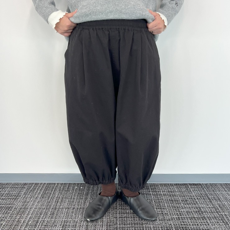 裾にゴムを施し立体感あるシルエットが脚のラインを拾わずカバーしてくれます。